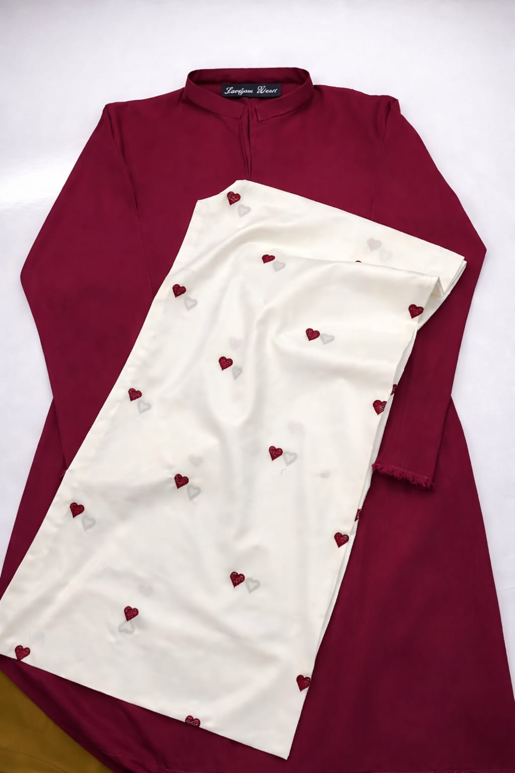 Shirt with elegant lace detailing and embroidered heart design on the trouser 💫Comfortable, classy, and timeless. By Zarqam Wear 🤍